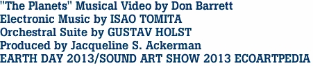 EARTH DAY 2013 celebrates Don Barrett Film "The Planets"/First produced by Jacqueline S. Ackerman/Electronic Music by ISA TOMITA and honors GUSTAV HOLST for his 1916 orchestral suite "The Planets"...Visit the Exhibition atSOUND ART SHOW 2013 ECOARTPEDIA Exhibition